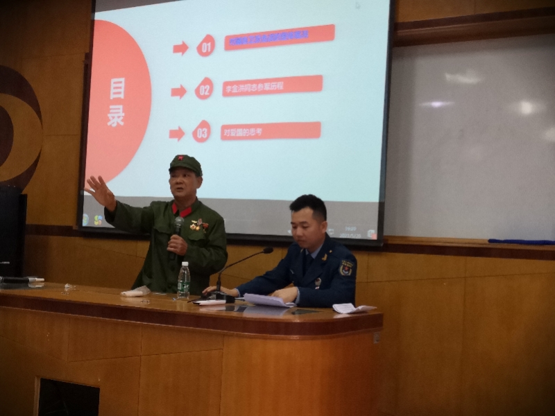 由于身體不適,李金洪無法長時(shí)間親述那段崢嶸歲月,但是這位老兵又是那么熱心地想讓更多后輩知道祖國的不容易,人民當(dāng)今幸福生活的來之不易,毅然接受邀請,克服身體不適,再次走上講臺,結(jié)合親身經(jīng)歷給在場師生講述1979年那段崢嶸歲月。李金洪表示,軍人的使命是保衛(wèi)祖國,抵抗侵略,“如果再給我選擇的機(jī)會,我還是義無反顧上戰(zhàn)場,我們有偉大的共產(chǎn)黨、有偉大的制度、有偉大的祖國和人民,我們應(yīng)該為自己是一名中國人和生活在祖國的大地上感到驕傲和自豪”。