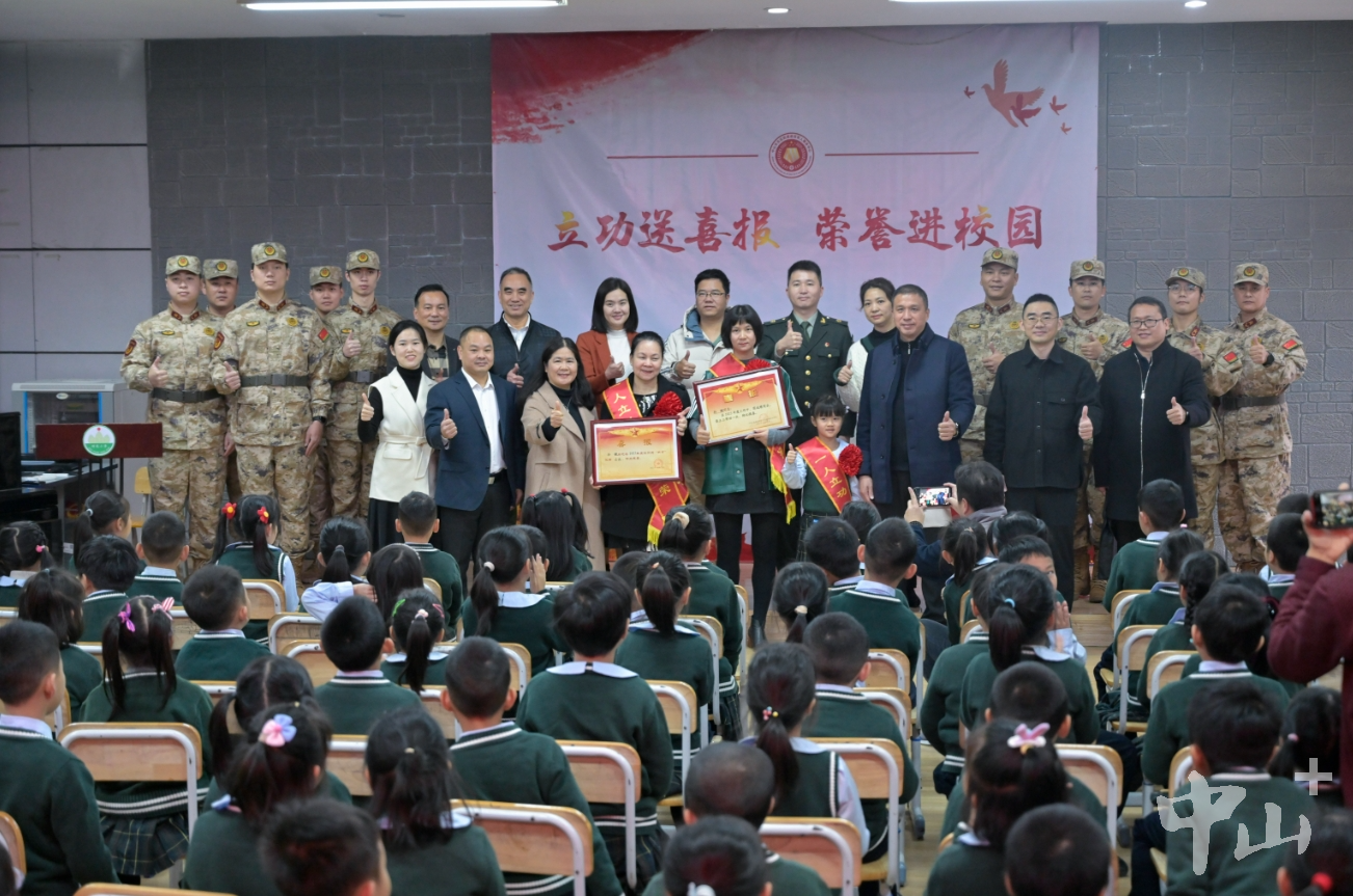 拉橫幅、敲鑼鼓、舞龍獅……2月29日一早,東區(qū)街道竹苑社區(qū)迎來了一支敲鑼打鼓、舞龍舞獅的隊伍,一路喜氣洋洋,熱鬧非凡。游行隊伍將一份立功受獎的榮譽(yù),帶到了榮立三等功的現(xiàn)役軍人孫鍵女兒孫頌雅所在的竹苑小學(xué),熱鬧的場面吸引許多鄉(xiāng)親、商戶等前來圍觀祝賀。 聯(lián)合送喜報,儀式感拉滿 校園內(nèi),在讀小學(xué)一年級的“軍娃”孫頌雅和她的同學(xué)、老師等共同見證了這一榮耀時刻。東區(qū)街道黨工委書記周俊峰將三等功喜報送到孫頌雅一家人手上,市退役軍人事務(wù)局黨組成員、副局長陳光林為他們送上慰問金,并為其佩戴光榮綬帶“一人立功,全家光榮”,一家人臉上洋溢著開心且自豪的笑容。  孫頌雅一家人在學(xué)校收到立功喜報。記者 易承樂 攝