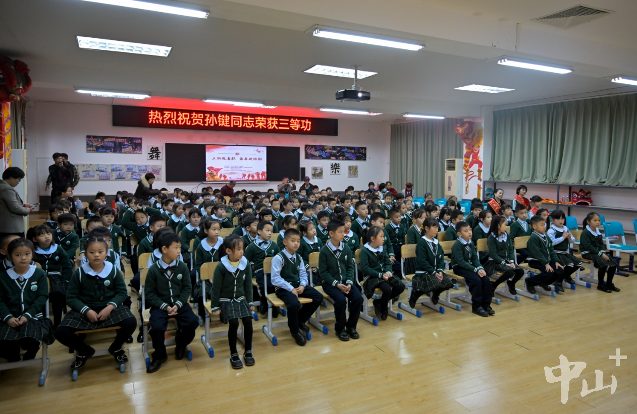 喜報一頭連著軍心士氣,一頭系著軍屬情懷?;顒蝇F(xiàn)場,榮立三等功的現(xiàn)役軍人孫鍵通過視頻向女兒說出心里話:“我最親愛的女兒頌雅,爸爸多么想陪伴在你的身邊,每一個節(jié)假日,每一天,看著你慢慢地成長。但是天下雖安,忘戰(zhàn)必危。國無防不立,民無兵不安,爸爸要保家衛(wèi)國。我的女兒,希望你理解和體諒爸爸的不能陪伴。爸爸也曾經(jīng)是竹苑小學(xué)的學(xué)生,從這里走出去,走向祖國更需要爸爸的地方……” 據(jù)介紹,2014年起至今,孫鍵在中國人民解放軍某部隊服役,因表現(xiàn)突出榮獲“四有”優(yōu)秀士兵、榮立三等功。因常年在部隊,孫鍵不能像其他孩子的父親那樣給予女兒更多關(guān)愛和陪伴,他們只能通過手機(jī)交流。 孫鍵的妻子郭麗說:“丈夫從小就想當(dāng)兵,大學(xué)畢業(yè)后他選擇參軍報國,我們一直默默支持他。今天的儀式太隆重了,我平時很少跟女兒講爸爸的工作到底是什么,孩子的性格有點(diǎn)內(nèi)向,爸爸想讓女兒在學(xué)校過得更開心,更開朗一些?!?/p> 開展紅色宣講,愛國主義教育進(jìn)校園 記者現(xiàn)場看到,活動還邀請了“中國好人”、東區(qū)街道退役軍人紅旗志愿服務(wù)隊隊長李克為大家上了一堂生動的愛國主義教育課,并將移動軍旅展覽館帶到校園,通過紅色宣講和軍旅物品展示,把愛國情懷厚植于小朋友們幼小的心靈中。  為孩子們上愛國主義教育課。記者 易承樂 攝