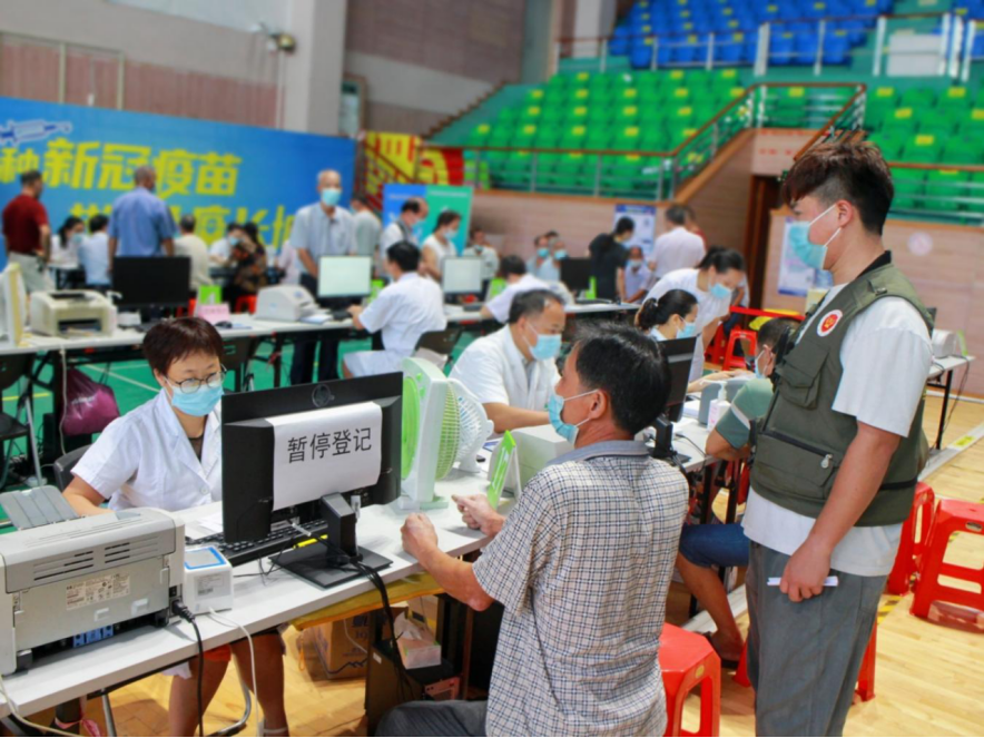 志愿者們依次指引重點(diǎn)優(yōu)撫對(duì)象們?nèi)サ阶稍兊怯泤^(qū)、量血壓區(qū)、接種區(qū)和留觀區(qū),逐個(gè)完成新冠疫苗接種。