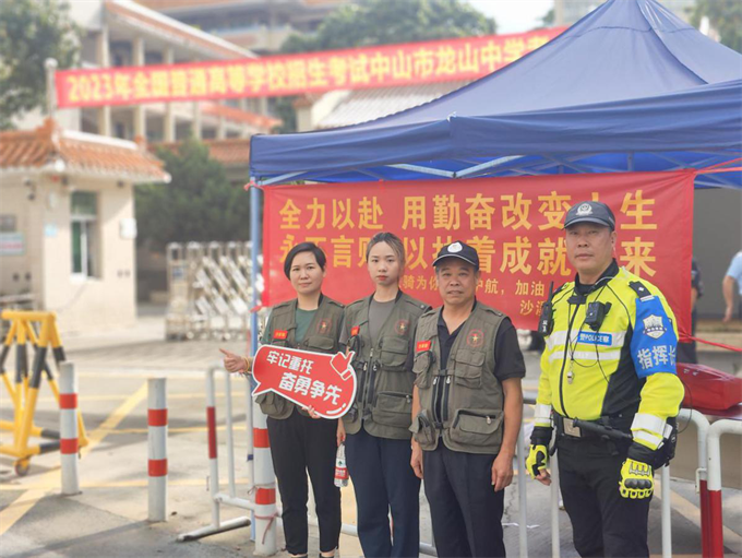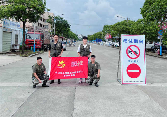 小欖鎮(zhèn)退役軍人志愿者在小欖中學(xué)考場附近開展護(hù)航高考志愿服務(wù)活動(dòng)。