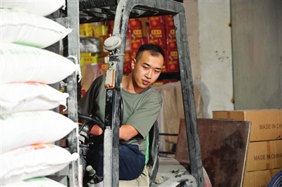 2018年,楊澤明退役回到三角鎮(zhèn),從一名基層業(yè)務(wù)員做起,幾年內(nèi)便成立了一家貿(mào)易公司,成為當(dāng)?shù)胤掂l(xiāng)創(chuàng)業(yè)青年推動(dòng)“百千萬(wàn)工程”落地見效的典型代表。6月3日下午,記者在該公司的倉(cāng)庫(kù)門口見到了正在開著叉車運(yùn)輸面粉的楊澤明,他至今仍保持著軍人特有的精氣神。