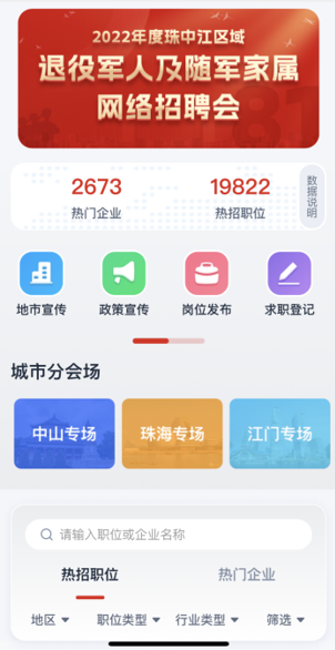 2022年度珠中江區(qū)域退役軍人及隨軍家屬網(wǎng)絡(luò)招聘會(huì)頁面。 主頁分設(shè)城市宣傳專區(qū)、政策宣傳專區(qū)、崗位發(fā)布入口、求職登記入口、求職訂閱服務(wù)、在線測評共六大功能板塊。 招聘會(huì)設(shè)置退役軍人就業(yè)指導(dǎo)員,根據(jù)就業(yè)及企業(yè)需求調(diào)研結(jié)果,對有求職意向的退役軍人和隨軍家屬提供精準(zhǔn)匹配及推送、政策咨詢、簡歷指導(dǎo)、崗位推薦等就業(yè)指導(dǎo)服務(wù)。 一、求職登記流程 1、求職登記 手機(jī)掃碼進(jìn)入【2022年度珠中江區(qū)域退役軍人及隨軍家屬網(wǎng)絡(luò)招聘會(huì)】,電腦端可通過文章左下方原文鏈接進(jìn)入專場。點(diǎn)擊【求職登記】即可登記,登記成功后,企業(yè)HR可以通過平臺與求職者聯(lián)系溝通。