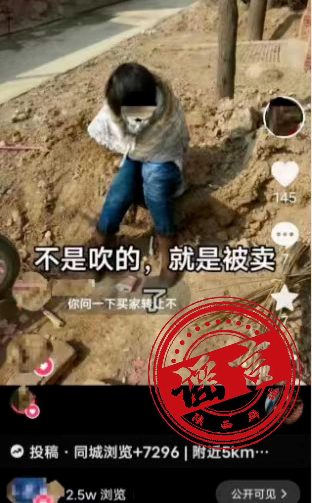 2024年1月10日,網(wǎng)民張某某(女,39歲,蒲城龍陽人)為博取關(guān)注、吸引流量,利用了一張自己14年前拍攝坐在土堆前的照片,并配有“不是吹的,就是被賣了”的字眼制作成視頻后,發(fā)布在抖音平臺上,同時與網(wǎng)民互動交流,先后有超過2.5萬人次瀏覽。