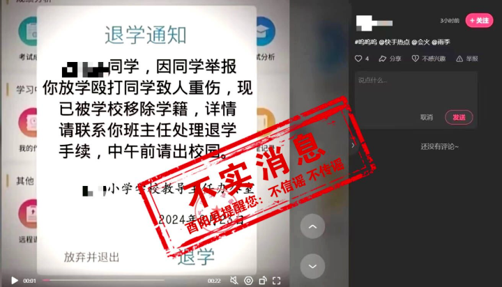無獨有偶,近期重慶酉陽縣某小學一學生也對這則謠言進行“模仿秀”,在網(wǎng)上惡搞“克隆”出“退學通知”,并以學校名義署名落款。相關謠言在網(wǎng)上傳播后引發(fā)議論。目前,這則謠言已被刪除,學校對該學生進行了批評教育。