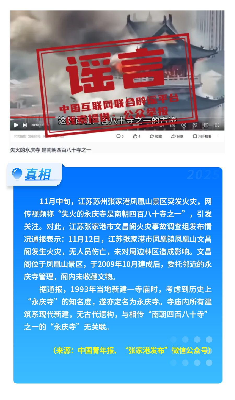 社會(huì)熱點(diǎn)事件被歪曲蹭炒。首屆“蘇超”聯(lián)賽泰州隊(duì)奪冠后,“冠軍獲五十萬獎(jiǎng)金、城市地圖放大字號(hào)”等謠言流傳,以夸張信息博眼球、引流量;江蘇張家港鳳凰山景區(qū)火災(zāi)后,“‘南朝四百八十寺之一’被燒”的謠言引發(fā)熱議,通報(bào)顯示失火建筑為2009年新建,與歷史上的南朝寺廟無關(guān)聯(lián)。