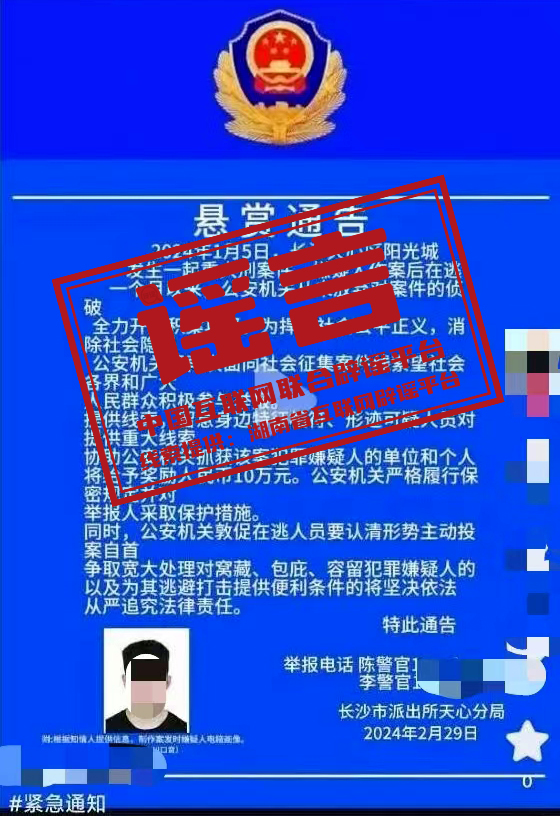 謠  湖南省長(zhǎng)沙市天心區(qū)發(fā)生重大刑案,警方發(fā)布懸賞通告?