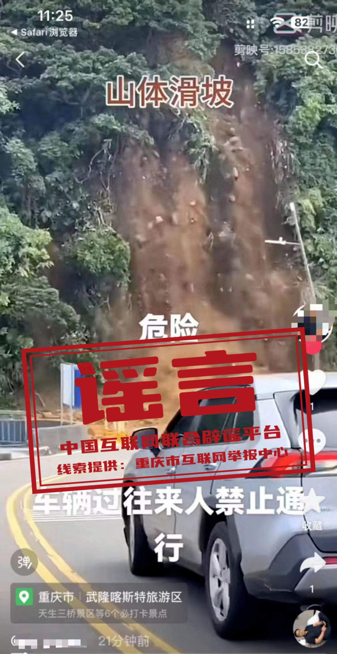 真相:近日,有網(wǎng)民發(fā)布了一則“山體滑坡危險,過往車輛行人禁止通行”的視頻,視頻定位標(biāo)注為“重慶市武隆喀斯特旅游區(qū)”。經(jīng)重慶市武隆區(qū)多部門核實,該區(qū)近期未發(fā)生大面積山體滑坡事件。網(wǎng)傳視頻實為2024年6月3日臺灣省基隆市中正區(qū)潮境公園入口發(fā)生的大規(guī)模山體滑坡事件,而視頻中所標(biāo)注的定位信息系網(wǎng)民發(fā)布視頻的地點,而非事件發(fā)生的地點。(來源:“重慶辟謠”微信公眾號、網(wǎng)信武?。?/span>