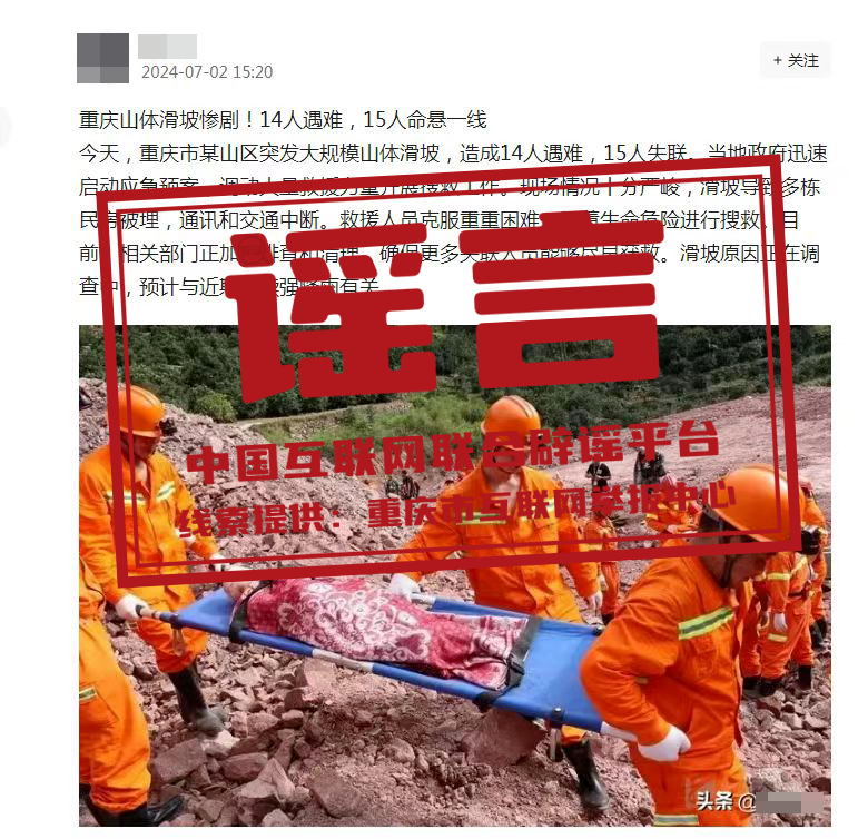 真相:7月2日,某網(wǎng)民發(fā)布信息稱,“重慶市某山區(qū)突發(fā)大規(guī)模山體滑坡,造成14人遇難,15人失聯(lián)。”經(jīng)相關部門核實,重慶近日未發(fā)生相關地質災害,網(wǎng)傳信息系謠言。(來源:重慶辟謠)