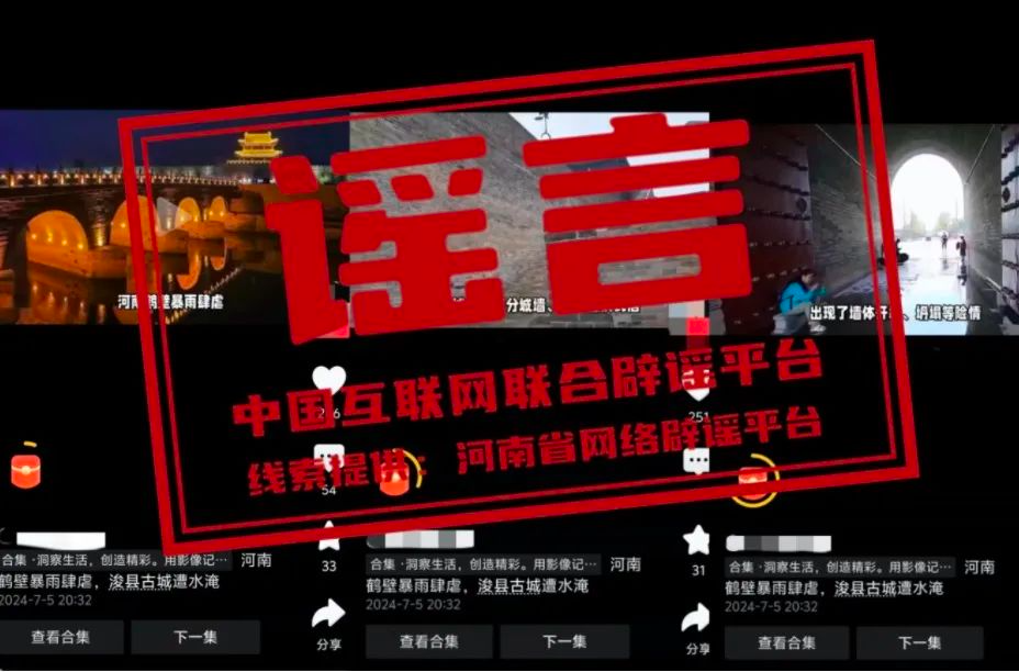 真相:近日,有網(wǎng)民在網(wǎng)絡(luò)平臺發(fā)布內(nèi)容為“河南鶴壁暴雨肆虐,浚縣古城遭水淹”的視頻信息,引發(fā)社會關(guān)注。經(jīng)核實,7月5日??h出現(xiàn)暴雨天氣,強降雨期間??h古城北大街、東城門廣場等處出現(xiàn)積水情況,經(jīng)過積極排澇,雨停后路面積水很快被排空,恢復(fù)正常通行,不存在視頻中所說的“古城風(fēng)貌受損嚴(yán)重”“古城內(nèi)的部分城墻、古街巷出現(xiàn)不同程度的損毀”“古城墻出現(xiàn)了墻體開裂、坍塌等險情”“古城內(nèi)的博物館、紀(jì)念館等文化設(shè)施也遭受不同程度的損失”等現(xiàn)象。該視頻多為當(dāng)?shù)嘏f聞及外地視頻嫁接拼湊。目前,??h古城秩序正常。(來源:河南省網(wǎng)絡(luò)辟謠平臺、浚縣古城保護(hù)建設(shè)服務(wù)中心)