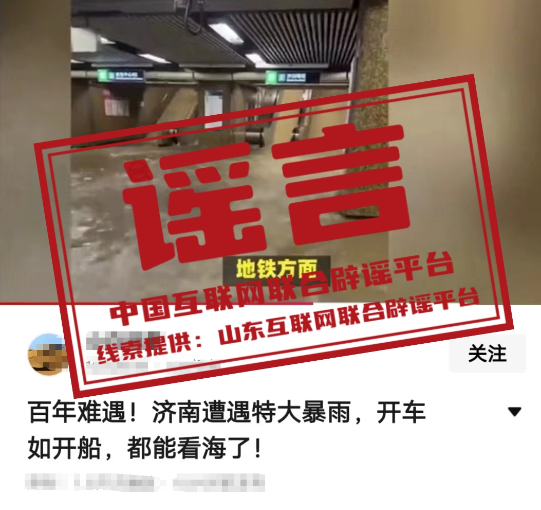 真相:7月22日,一則內(nèi)容為“百年難遇!濟南遭遇特大暴雨,開車如開船”的視頻信息在網(wǎng)絡(luò)傳播,視頻中還摻雜“車庫倒灌”“地鐵被淹”等水災(zāi)畫面。經(jīng)當(dāng)?shù)叵嚓P(guān)部門核實,濟南市氣象臺于22日11時解除雷雨大風(fēng)黃色預(yù)警信號,當(dāng)日并未出現(xiàn)特大降雨情況。視頻中的地鐵、街道等場景不在濟南。該視頻信息為謠言。(來源:山東互聯(lián)網(wǎng)聯(lián)合辟謠平臺、濟南互聯(lián)網(wǎng)聯(lián)合辟謠平臺)