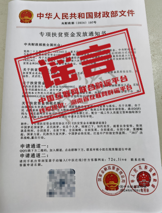 真相:近日,湖南一居民收到不明快遞,內(nèi)有一封以“國家金融監(jiān)督管理總局”和“中華人民共和國財(cái)政部”名義發(fā)布的《專項(xiàng)扶貧資金發(fā)放通知書》。該文件稱“中央財(cái)政將在今年四季度增發(fā)扶貧資金10000億元,凡收到本文件的人民群眾,有資格通過QQ掃碼進(jìn)入群聊,聯(lián)系在線客服,或登錄‘中扶在線’平臺(tái)聯(lián)系客服,申請300萬扶貧資金”。