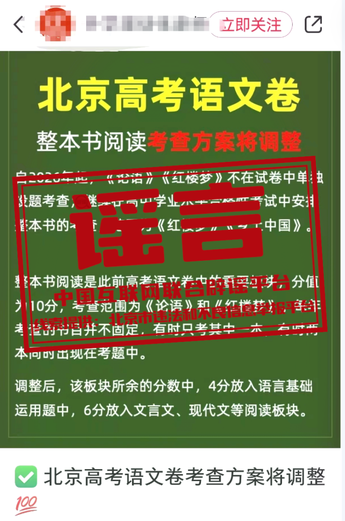 真相近日,關(guān)于“北京高考語文學(xué)科整本書閱讀考查方式調(diào)整”的消息在網(wǎng)絡(luò)上傳播,引發(fā)社會(huì)發(fā)注。對(duì)此,北京教育考試院發(fā)表聲明稱:該網(wǎng)傳內(nèi)容為不實(shí)信息。北京教育考試院沒有發(fā)布對(duì)北京高考語文整本書閱讀考查方式調(diào)整的相關(guān)內(nèi)容,北京高考語文2025、2026年的學(xué)科考試內(nèi)容保持穩(wěn)定,范圍不變。(來源:北京市違法和不良信息舉報(bào)平臺(tái)、“首都教育”微信公眾號(hào))