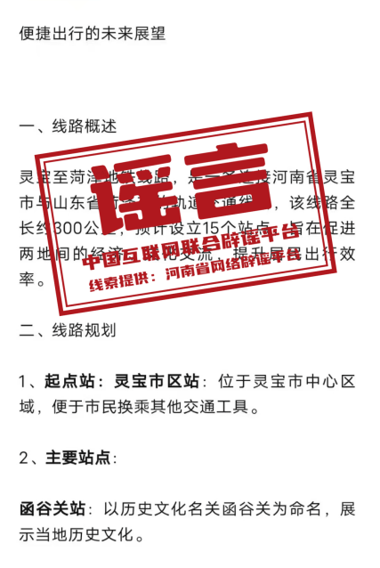 真相:近日,有自媒體賬號(hào)在互聯(lián)網(wǎng)平臺(tái)發(fā)布“靈寶到菏澤的地鐵”相關(guān)信息,稱“該線路全長(zhǎng)約300公里,預(yù)計(jì)設(shè)立15個(gè)站點(diǎn)”“起點(diǎn)站為靈寶市區(qū)站,位于靈寶市中心區(qū)域”,引發(fā)關(guān)注。經(jīng)核實(shí),該消息系虛假信息?;ヂ?lián)網(wǎng)不是法外之地,請(qǐng)自覺遵守法律法規(guī),不造謠、不信謠、不傳謠。(來源:“清朗河南”微信公眾號(hào)、網(wǎng)信靈寶)